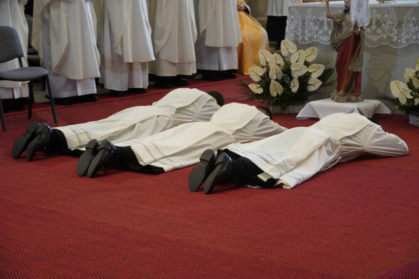 A szentbeszéd után a jelöltek letették a szentelési ígéreteiket, majd tiszteletet és engedelmességet fogadtak a mindenkori főpásztornak. Ezt követően, a teljes önátadás jeleként földre borultak, miközben a Mindenszentek litániáját imádkozva a jelenlevők a szentek közbenjárását kérték a jelöltekért.