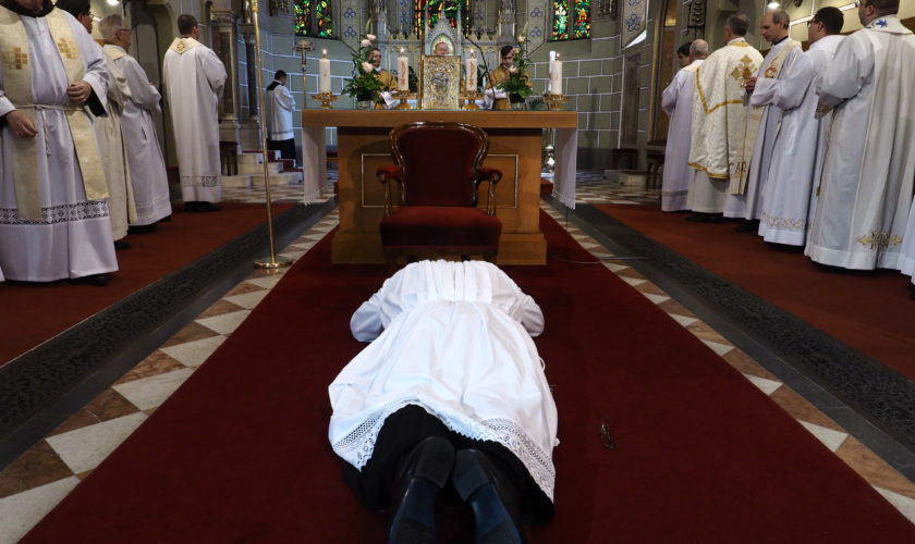 Ezt követően a szentelendő ígéretet tett feladata hűséges vállalásáról, majd a Mindenszentek litániája alatt leborult a földre, és a jelen lévő papokkal, hívekkel és rokonokkal együtt imádkozott. A szertartás keretében az érsek a kezét a szentelendő fejére téve mondta el a szentelés legfőbb imádságát: „Küldd el reá a Szentlelket, kérünk, Istenünk, hogy hétszeres kegyelmi ajándékod által a szolgálat hűséges végzésére erőt nyerjen.”