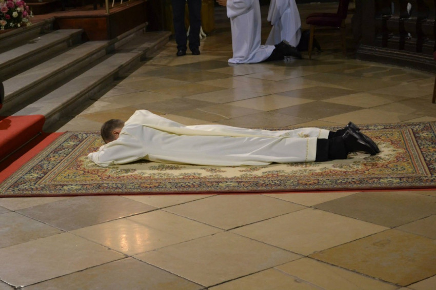 Ezután a Mindenszentek litániája alatt a szentelendő leborult a földre, a jelenlevők pedig térdelve imádkoztak. A földre borulás kifejezője annak a tudatnak, hogy Isten erejét meghaladó szolgálatra hívta meg őt az Úr. Ez a teljes önátadás kifejezője is egyben. Ezt követte a tulajdonképpeni szentelés: a kézrátétel és a felszentelő ima. A jelölt a főpásztor elé térdelt, aki két kezét fejére téve csendben imádkozott. A jelenlevő hívek is csendben imádkoztak, hálát adva az Úrnak, hogy munkást küldött az aratásába. Ezután a szentelő püspök, Böcskei László elimádkozta a felszentelő imát.