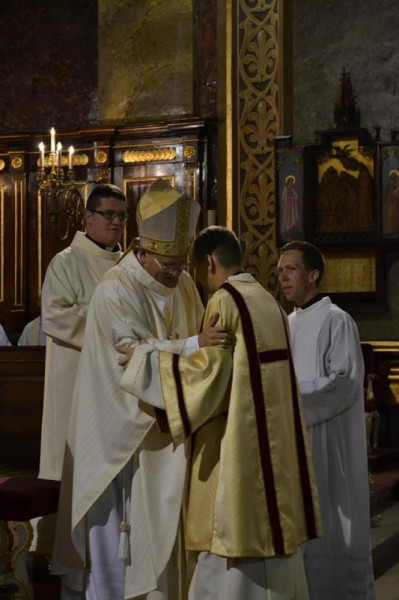 A szentelést követően az újonnan szentelt diakónus beöltözött a szerpapi öltözékbe, a keresztben viselt stólába és dalmatikába. Ezek után Bakos Gábor átvette a főpásztortól az evangéliumos könyvet, hiszen a diakónus egyik legfőbb feladata az evangélium hirdetése. Végül a püspök és a szentelésnél asszisztáló másik diakónus békecsókot váltottak az újonnan szentelttel, kifejezve köszöntésüket és Bakos Gábor befogadását a diakónusi közösségbe. A szentmise az Eucharisztia liturgiájával folytatódott.