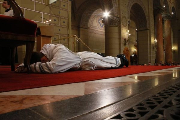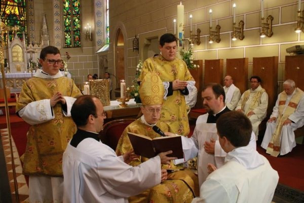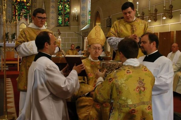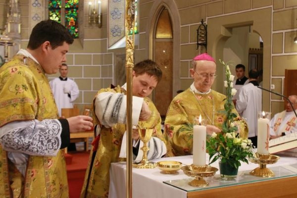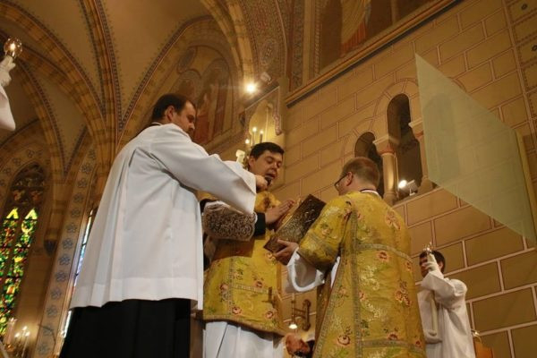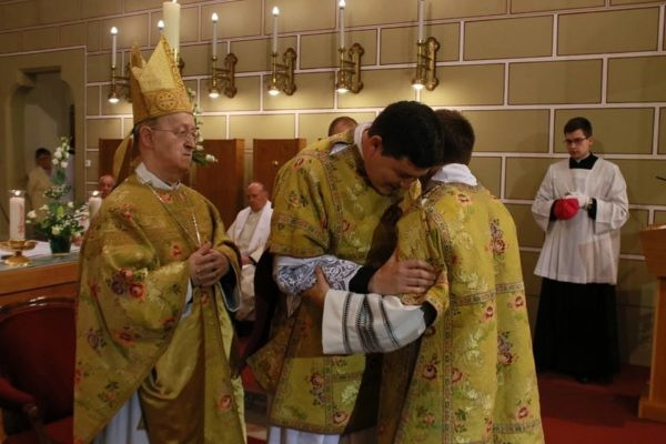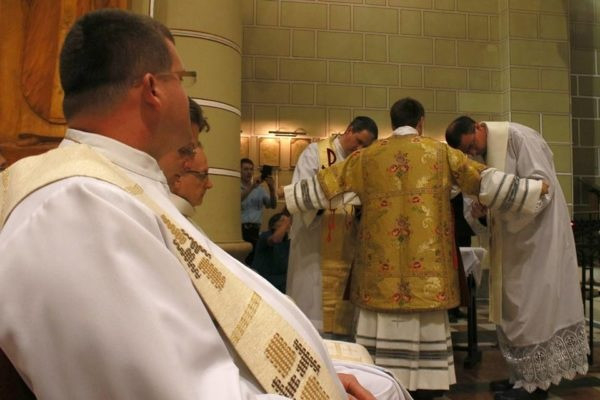 Végezetül a felszentelt új diakónust beöltöztették liturgikus ruháiba: a stólát a bal válláról átvetve a jobb oldalánál megkötötték, és ráadták a dalmatikát. Megkapta szolgálata eszközét, az evangéliumoskönyvet. Először az érsek, majd a diakónusok is békecsókot váltottak a felszentelt diakónussal. A szertartás további részében már az újonnan felszentelt diakónus volt a főpásztor segítségére a szentmise bemutatásában.