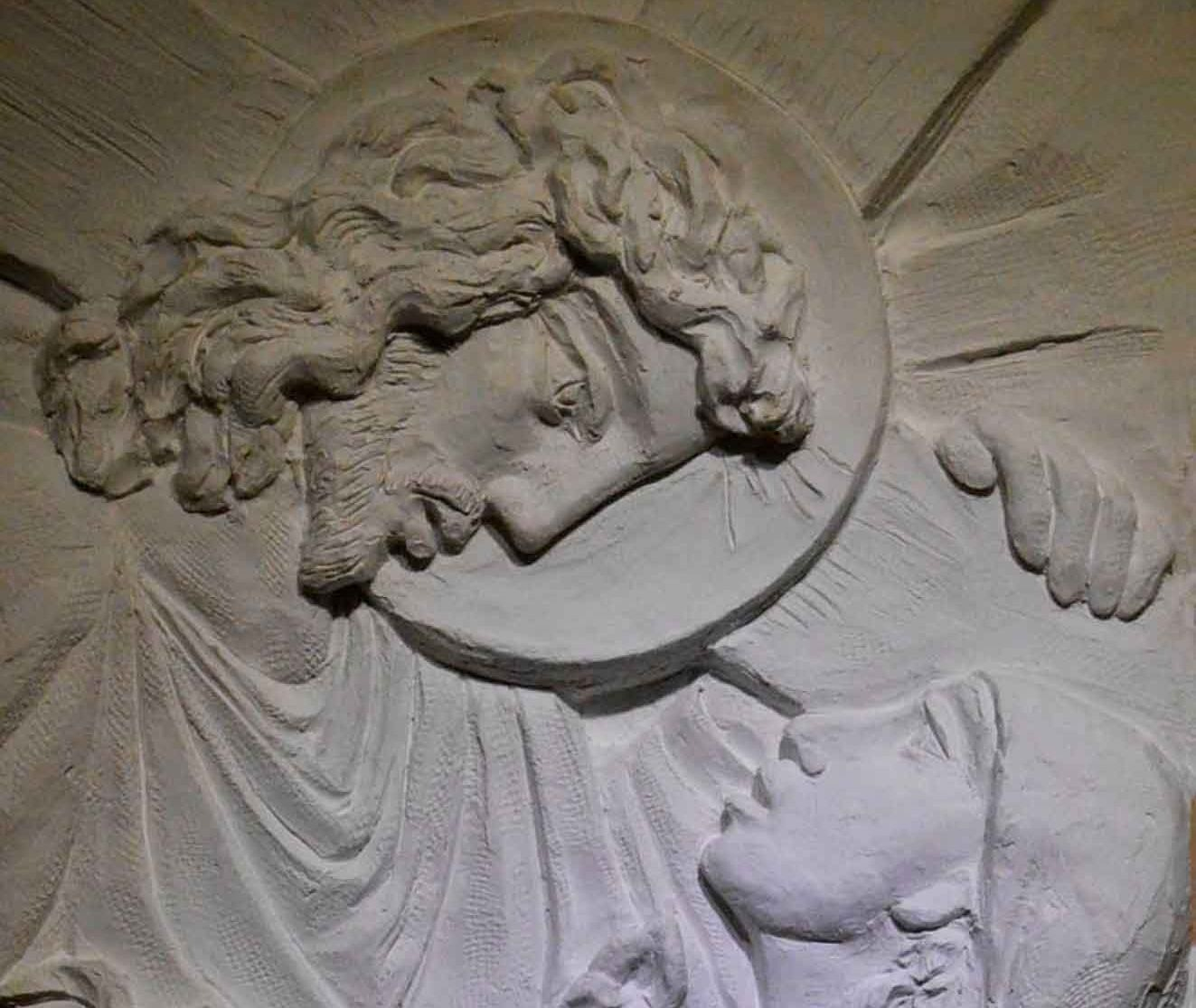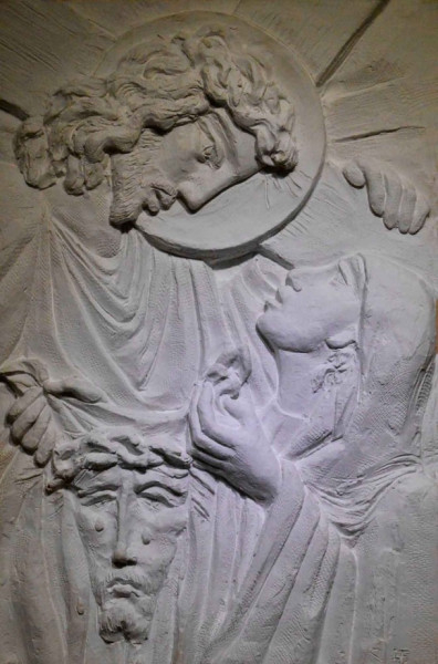 Illusztráció: Lebó Ferenc: Veronika kendőt nyújt Jézusnak (A győri keresztút hatodik stációja)