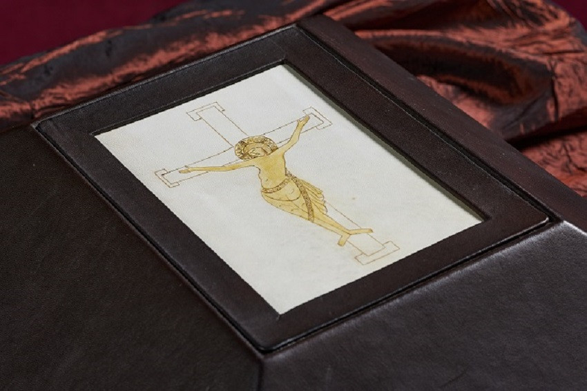 A könyvtestet nyolc milliméter vastag bükkfa táblák védik, amelyeket timsós cserzésű, színezetlen kecskebőr borít. A rézveretek és -csatok – a kötéshez hasonlóan – korabeli minták alapján, aprólékos munkával, kéziszerszámok segítségével készültek. A kötetet saját tervek alapján épített, fekete bőrrel borított és bordó hernyóselyemmel bélelt dobozban helyezték el, amelyet a kódexet illusztráló egyik tollrajz – a feszület – szintén kézzel festett másolata díszít.