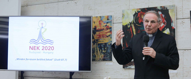 Mi, magyar katolikusok évek óta az eseményeken való aktív részvétellel várjuk a szeptemberi eucharisztikus kongresszust, ennek kézzelfogható módja az is, hogy templomainkban a vasárnapi szentmisék elején vagy végén imádkozunk a nagy egyházi ünnepség sikeréért – kezdte előadását Dolhai Lajos, aki a 2020. szeptember 13. és 20. között Budapesten megrendezendő 52. Nemzetközi Eucharisztikus Kongresszus (NEK) céljáról, az előkészület folyamatáról és főbb eseményeiről beszélt.