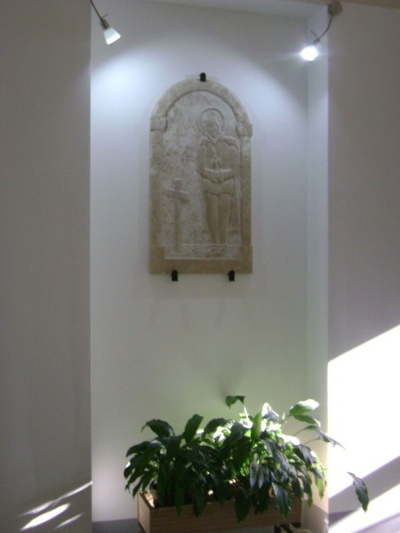 A dombormű egy nyolcadik osztályos diák édesapjának, Tóth Tamás képzőművésznek alkotása. Önzetlen felajánlásának köszönhetően készültel az iskola védőszentjének, Szent Imrének egész alakos domborműve mészkőből.