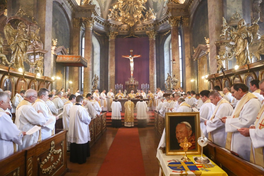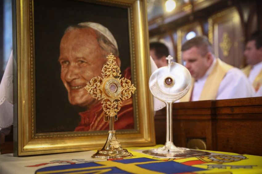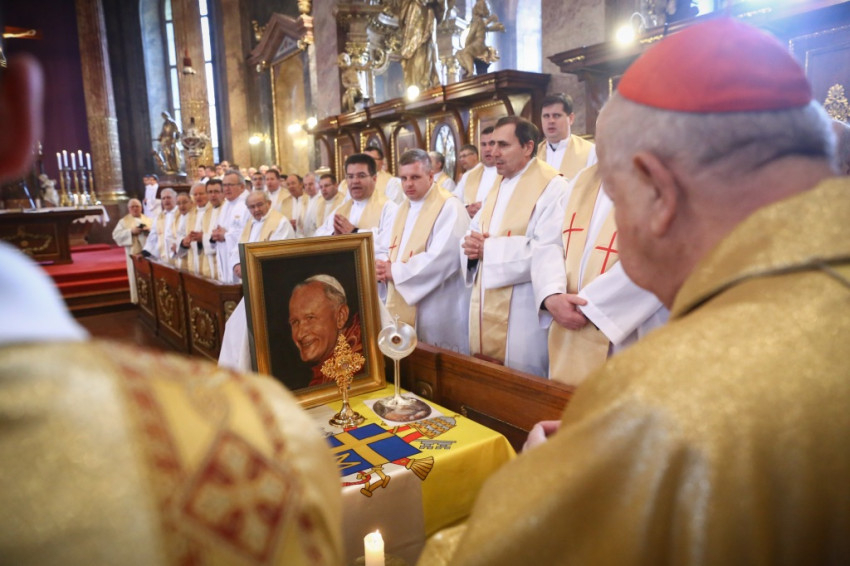 És jó pásztorrá vált Karol Wojtyła bíboros is, aki az isteni gondviselés kifürkészhetetlen akarata folytán az egyetemes egyház pásztora lett 1978. október 16-án. Még jobban ki kellett tárnia pásztori szívét, hogy minden nép, nyelv és kultúra beleférjen. A magyar nemzet pedig kivételes helyet kapott szívében, a lengyel és a magyar nép barátsága és közös történelme okán is. A pápának nem volt egyéb fegyvere, mint az Istenről és az emberről szóló igazság, valamint az evangélium – emelte ki a szónok, majd Szent II. János Pál pápa híres és ma is aktuális „Ne féljetek!” felszólítására emlékeztetett.