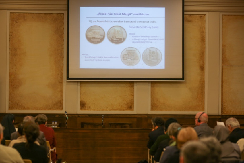 Születésének 775. évfordulóján az Árpád-házi szent tiszteletére a Magyar Nemzeti Bank (MNB) emlékérmet bocsátott ki, melyet a konferencián Baritz Sarolta Laura OP mutatott be. Aquinói Szent Tamás paradigmaértékű tételét idézte: a pénz nem cél, hanem eszköz, az emberi cselekedeteket motiváló értékhierarchia legalsó fokán áll. „Ha megértjük és helyesen fogjuk fel szerepét a gazdaságban, eljutunk a fenntartható fejlődés megvalósításához” – mutatott rá a közgazdász nővér. Az 1968 óta folyó emlékérme-kibocsátással az MNB is azt üzeni, a pénznek van önmagán túlmutató jelentősége, ezért is lehet az érme érték, a hagyományőrzés eszköze. A Szent Margit tiszteletére kibocsátott érme a bank új sorozatát vezeti be, mely az Árpád-házi szenteknek állít emléket. A Margit-érme Szöllőssy Enikő Munkácsy-díjas szobrász és érmeművész alkotása. Az előoldal fő motívuma a Margit-szigeti domonkos kolostor romjainak egy részlete, a hátlap Margitot ábrázolja Simone Martini Assissiben látható freskója alapján. Az érme 50 000 forintos arany és 2000 forintos névértékű színesfém kiadásban vásárolható meg a Magyar Pénzverő Zrt. érmeboltjában.