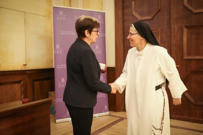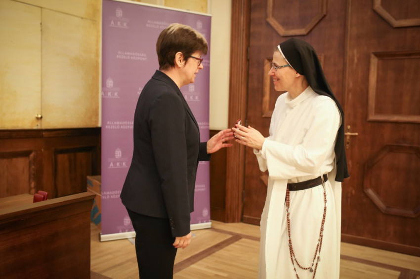 Horváthné Rudolf Teréz, a pénzverde vezérigazgatója Deák Hedvig általános főnöknőnek és Baritz Sarolta Laurának adott át egy-egy példányt.