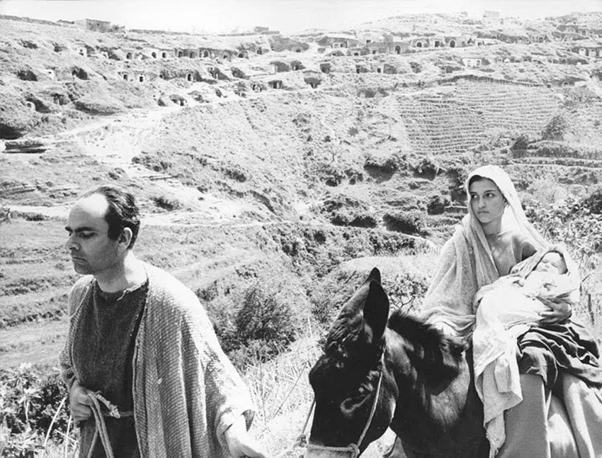 Pier Paolo Pasolini Máté evangéliuma (1964) című, költői szépségű filmjében gyönyörű Szűz Mária és József kapcsolatának ábrázolása. A mozi kezdő képsoraiban hosszasan nézik egymást. József szemrehányó tekintettel veszi tudomásul Mária áldott állapotát, mérhetetlen csalódottság van benne. Képtelen felfogni, hogy az az ember okozott neki ekkora fájdalmat, akit a legjobban szeretett a világon. Mária fiatal, hamvas bőrű lány, tükörsima, álomszép arcáról angyali jóság sugárzik. Tekintetében enyhe, szemérmes zavar tükröződik, fogalma sincs, hogyan magyarázza meg a megmagyarázhatatlant, hogy nem bűnös, hiszen a Szentlélektől fogant, és a Messiást hordozza méhében. Nem védekezik, nem mentegetőzik, nincs miért, de megérti József csalódottságát. Mária Isten kegyelmére bízza magát, érződik rajta, hogy bízik abban, az Úr nem hagyja magára, ha egyszer abban a hihetetlen kegyelemben részesítette, hogy az ő egyszülött fiát hordhatja a szíve alatt.