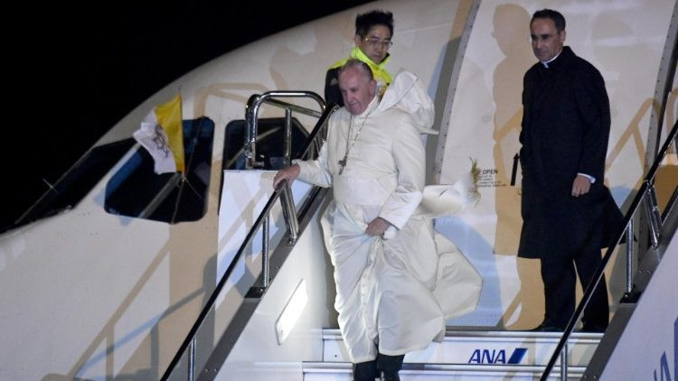 Ferenc pápa a tokiói repülőtéri fogadtatás után a nunciatúrára hajtott, ahol még az este találkozik a japán katolikus püspökökkel. Vasárnap és hétfőn folytatja sűrű programmal teli kétnapos japáni látogatását.