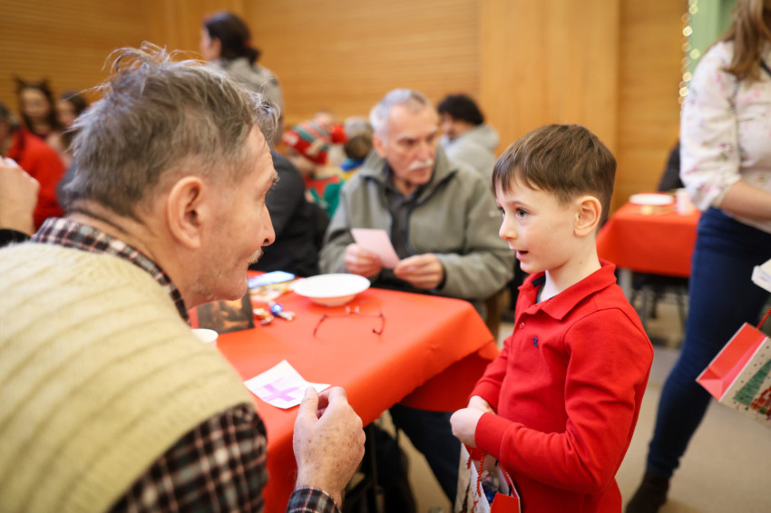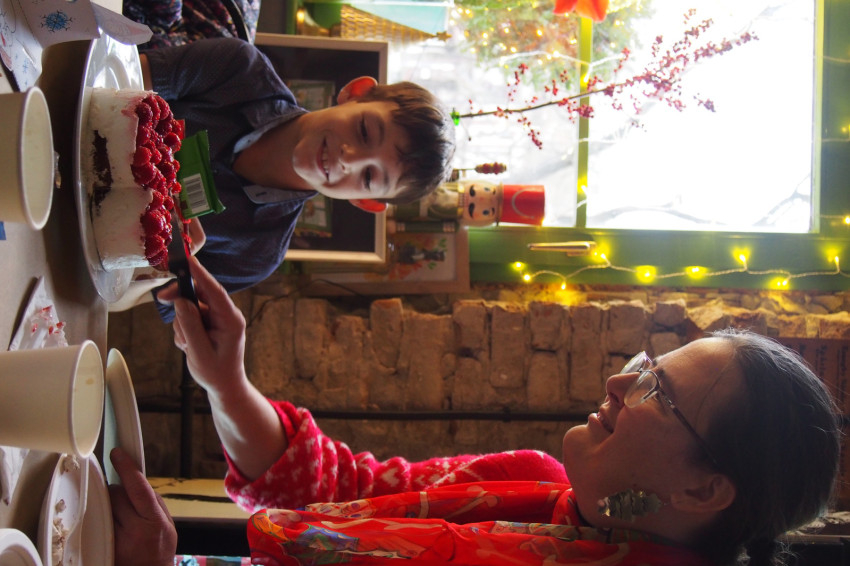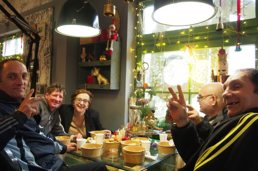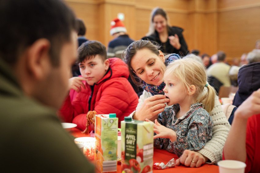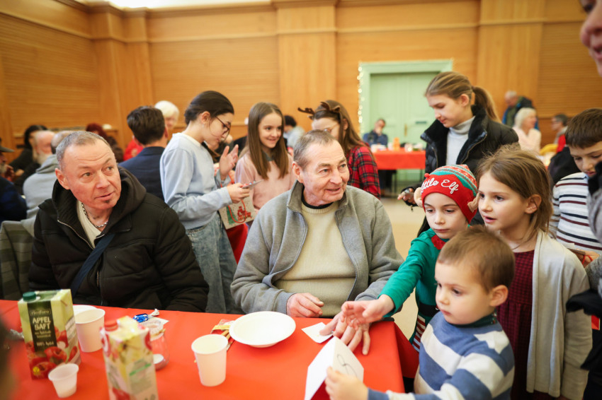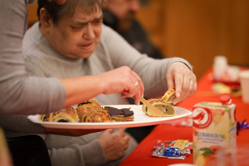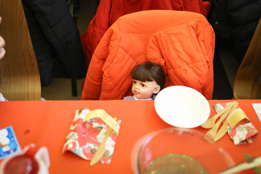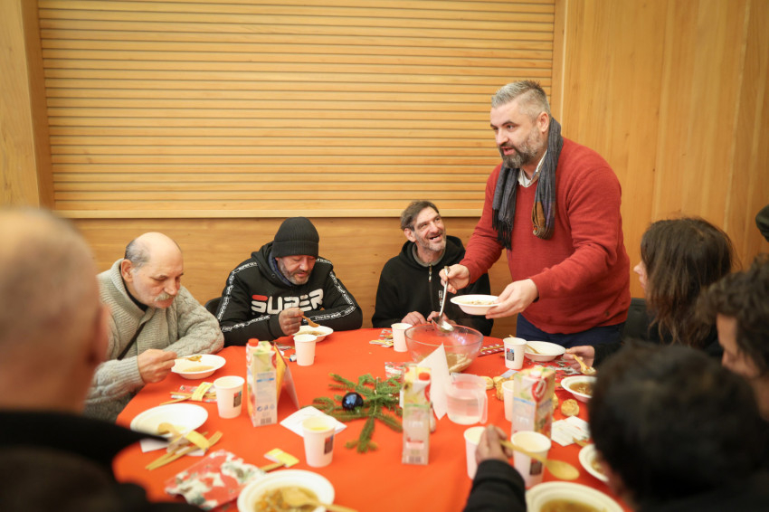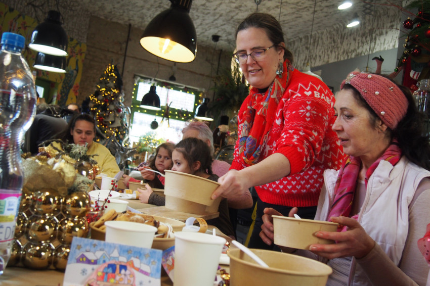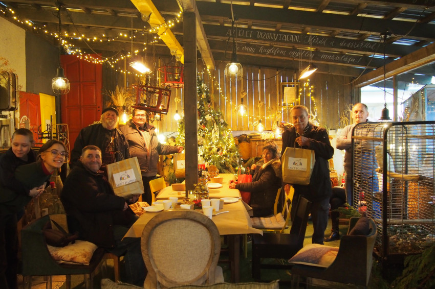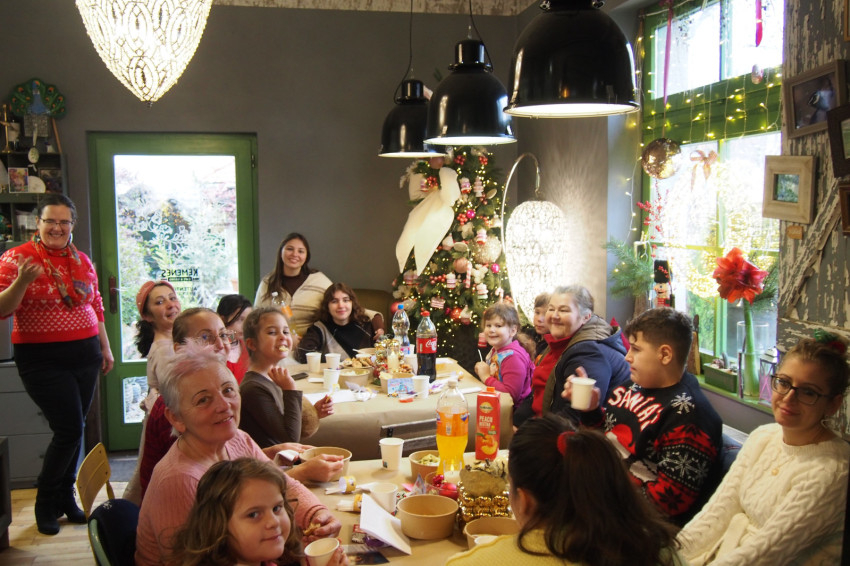 A különleges díszbe öltözött kicsiny helyiségekben a meghívottak úgy érezték, egy karácsonyi mese díszletei közé lépnek be, miután a templomban együtt hallgatták meg a születés örömhírét. Fuvolaszó kíséretében karácsonyi dalokat énekeltek, ezt követően érkezett a finom ebéd, amelynek végén a bisztró süteménnyel is kedveskedett a vendégeknek. A sok gyerek jelenléte különösen vidámmá tette az együttlétet, amelynek végén a 11 éves Kevin születésnapját is megünnepelték.
