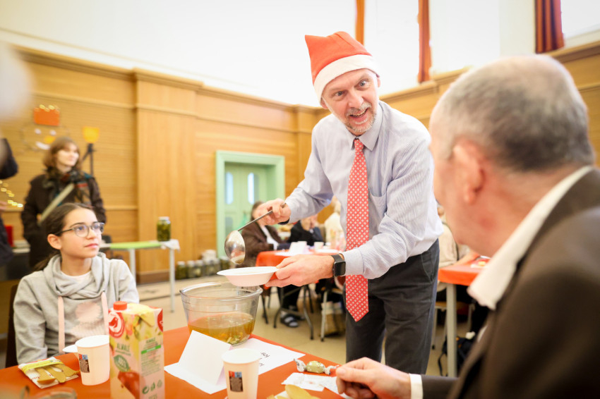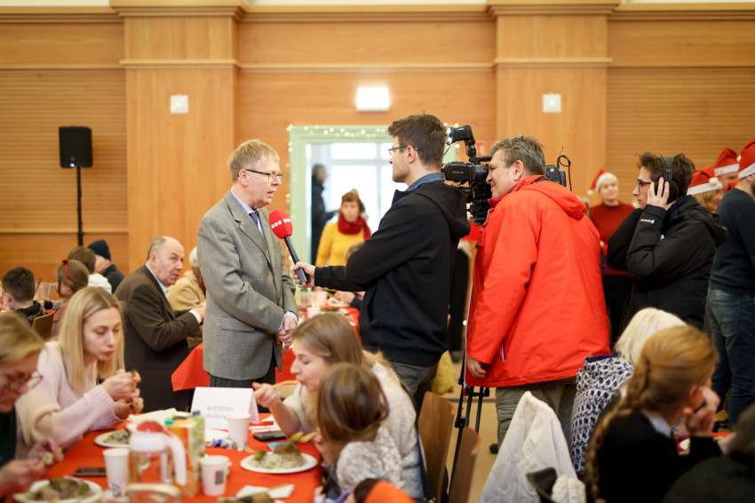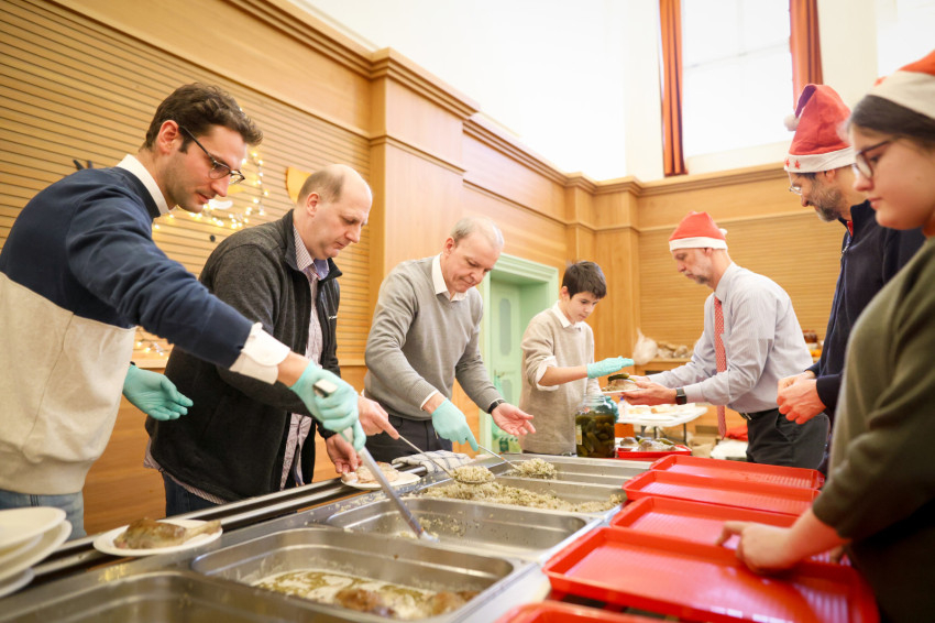 A budai ciszterci gimnázium most először adott otthont a szegények karácsonyi ebédjének. Különösen is köszönet illeti Barlay Bence igazgatót, aki egész családjával együtt fel is szolgált az ebéden. Mint minden önkéntest, őt is egy meghatározott asztalhoz osztottuk be: az ott ülő idősek ámulattal fogadták, hogy a patinás intézmény vezetője hozza nekik az újházi tyúkhúslevest, a töltött csirkét és a bejglit. Megvalósulni látszottak XVI. Benedek és Ferenc pápa szavai: