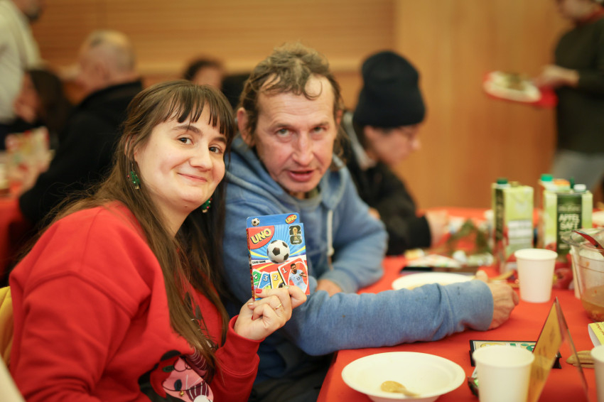 Karácsonykor együtt a család – mondják. De akinek nincs családja? Az ebéden felszolgálók között teljes családok is voltak: nagyszülők és szülők kicsi, iskolás vagy egyetemista gyerekeikkel, mint például a Juverka vokál, azaz Beke Csilla és lányai. Nincs karácsonyi ebéd műsor nélkül, amiben helyet kaptak karácsonyi énekek és jazz örökzöldek, fedél nélküli barátaink, mint Szamóca és Balázs versei és dalai saját előadásukban, vagy Aranka néni a Rózsa utcai idősek otthonából, egykori szórakoztató zenész, aki örömmel ült le itt a billentyűk mögé.