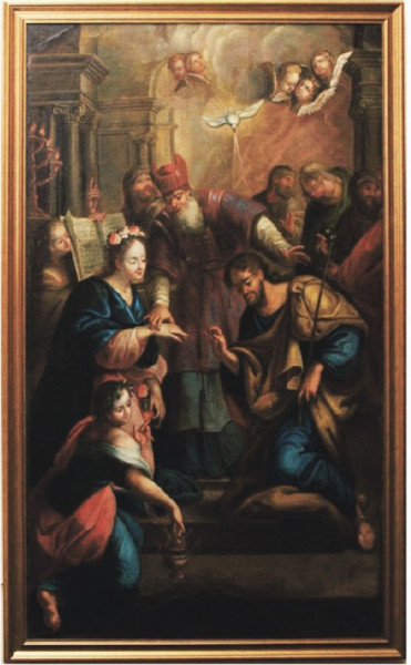 A szabadkai művészettörténész, restaurátor a Szűz Mária és Szent József eljegyzését is elemzi idézett tanulmányában: „A Mária eljegyzése vagy menyegzője ábrázolások a 16. században kibontakozó Szent József-kultusszal függnek össze, s a Habsburg Birodalomban válnak különösen népszerűvé az uralkodócsalád jóvoltából. Szent József ünnepnapja március 19-e. Balról a rózsaszín ruhás Szűz Mária térdel rózsakoszorúval a fején, kiengedett hullámos haja kék köpenyére omlik, bal kezében rózsakoszorút tart, jobb kezét az ifjú pár fölé hajoló főpap fogja, melyre az előttük mélyen meghajló szakállas, hosszú hajú Szent József készül gyűrűt húzni. Ruhája hagyományosan világoskék, sárga palástja gazdagon redőződik, bal kezében a kivirágzott botot fogja, mely alapján a legenda szerint a Szűz jegyesének választották és amelyből Jakab protoevangéliuma szerint egy galamb, a Szentlélek jelképe szállt fel. Körülöttük a csodát heves gesztusokkal megvitató nők és férfiak. A fehér szakállas főpap süvege vörös, fehér alsóruhát és lila kaftánt visel. Szűz Mária háta mögött egy templomi szűz szertartáskönyvet emel a paphoz, előtte, az alsó lépcsőn, egy másik kék ruhás babérkoszorús füstölőt lenget. A háttérben menorah és szárnyas angyalfejek. Az eredetileg íves záródású festmény felső félkörös végződését levágták, de az alsó és a felső keskenyedő, íves formák jól felismerhetőek a régi dublírozású oltárképen. A mellékoltárkép Carlo Maratta azonos témájú kompozíciójának nyomán készült, azzal a különbséggel, hogy Szent Józsefet nem öregemberként, hanem a Szűzhöz jobban illő ifjúként jelenítette meg a művész, valamint letérdeltette őket, és mellékszereplőkkel gazdagította a jelenetet.”