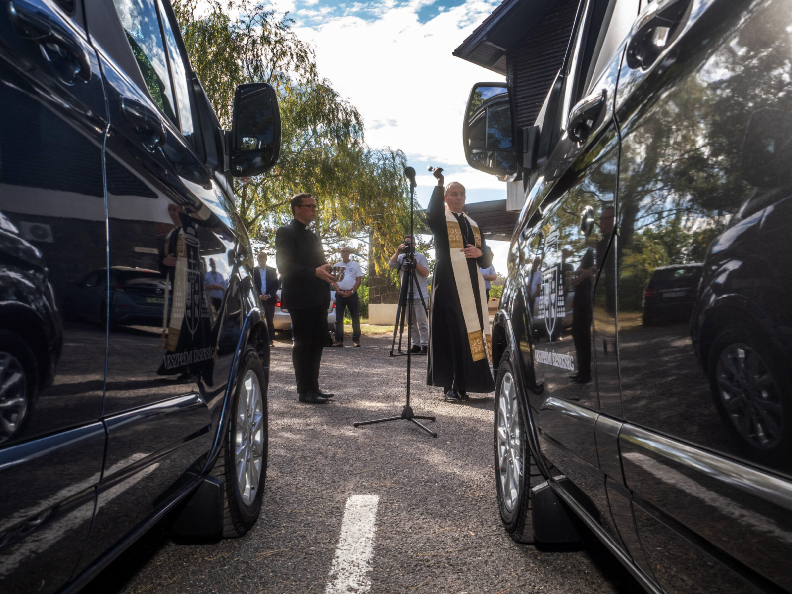 Az érsek beszéde után megáldotta a kisbuszok használóit, majd pedig a járműveket is.