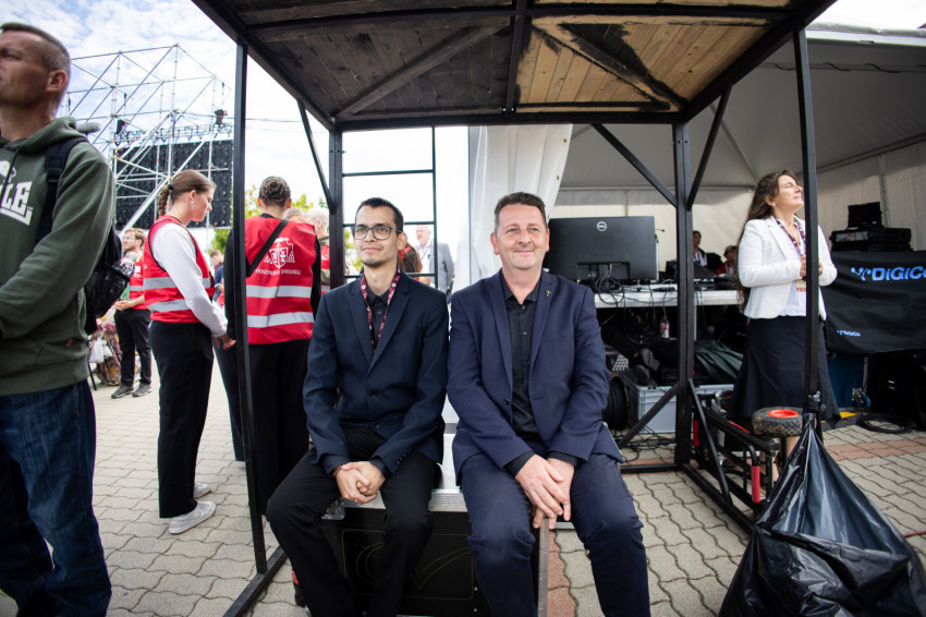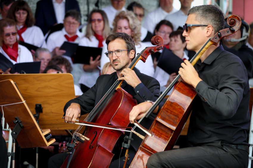 A zenei szolgálatot egy majdnem százfős egyesített ének- és zenekar végezte, melynek része volt a Mendelssohn Kamarazenekar, az Orlando Énekegyüttes, a veszprémi főszékesegyház Szent Mihály kórusa, a veszprémi Regina Mundi-plébánia Schola Regina kórusa és a keszthelyi kármelita bazilika kórusa. A művészeti vezetők Kovács Péter, Vikman Pál, Németh Kristóf, Szamosi Szabolcs voltak. Orgonán közreműködött Kovács Szilárd Ferenc, a pécsi székesegyház orgonaművésze, akinek Werner Alajos Mercedes-mise-átirata is elhangzott.