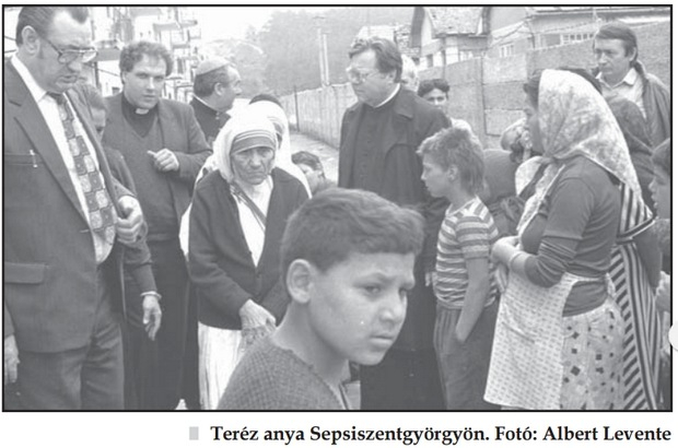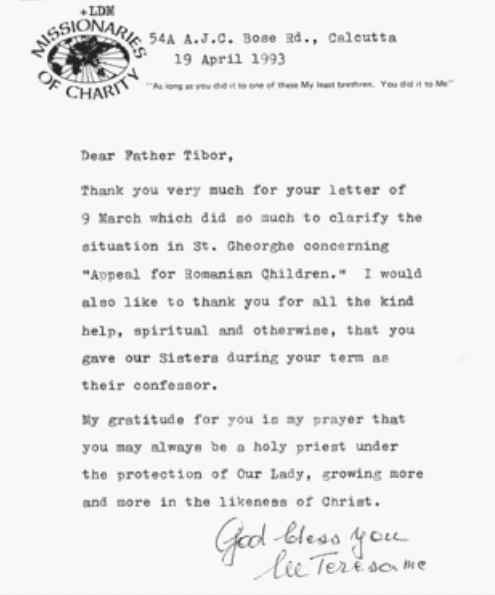 Sepsiszentgyörgyre érkezve a hivatalos fogadtatás végén mindenki távozott. Igyekeztem volna én is, de Teréz anya megállított: »Atya, ma még nem vettünk részt szentmisén, kérem, misézzen nekünk angol nyelven, mert az angol a rendünk hivatalos nyelve.« Mentegetőztem: »Sohasem miséztem angolul, misekönyvem sincs.« »Van nekem – válaszolta – és mert ez az első napunk itt, kellene egy rövid elmélkedés, prédikáció.« »Angol Bibliám sincs« – mondtam, és éreztem, megy el az erőm. »Adok én« – mosolygott rám. »És mikor legyen a szentmise«? – kérdeztem. »Egy óra múlva – válaszolta –, addig fel tud készülni.« A szentmise végén Teréz anya hozzám lépett, a kezét nyújtotta: »Köszönöm a szolgálatot, atya!« Kezet nyújtottam én is, de amikor láttam, hogy kezet akar csókolni, el akartam húzni a kezem, de nem engedte. Rám nézett és így szólt: »Ez nem neked szól, atya, hanem Jézusnak, akit a kezedben tartottál« Később elgondolkodtam: ki kinek prédikált?