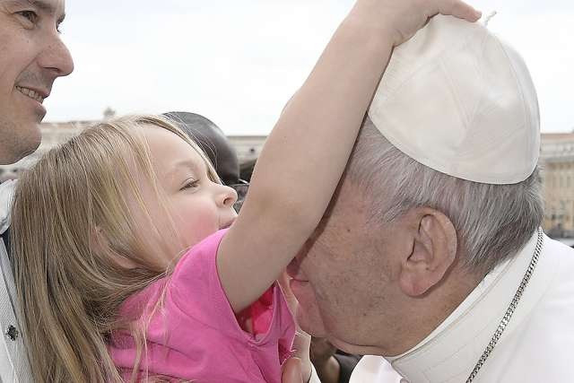 Odaadogatták a kislányt Ferenc pápához, aki adott neki egy puszit – miközben a kislány váratlanul kinyújtotta kezecskéjét, és ügyesen leemelte a pileólust az egyházfő fejéről, aki nagy kacagással észrevételezte az esetet.