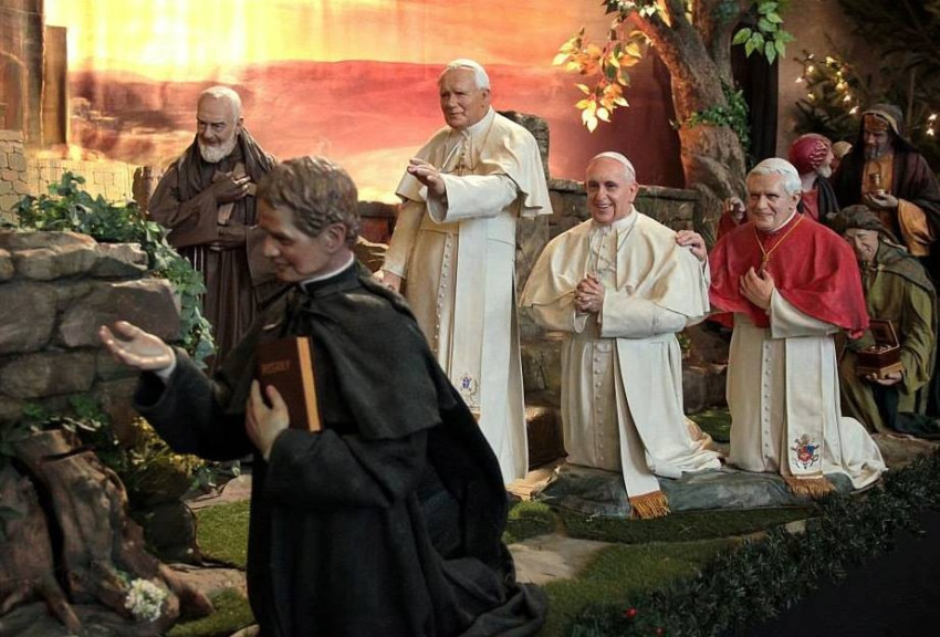 A pásztorok és a három napkeleti bölcs szobrai mellett ott látható a betlehemben Bosco Szent János, Szent II. János Pál pápa, Szent Faustina nővér, Szent Pio atya, Kalkuttai Boldog Teréz anya, valamint Benedek emeritus pápa és Ferenc pápa szobra is. A különleges betlehem hátterében a város panorámája látható.