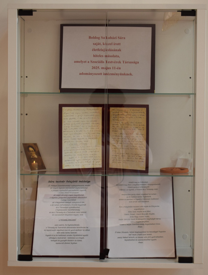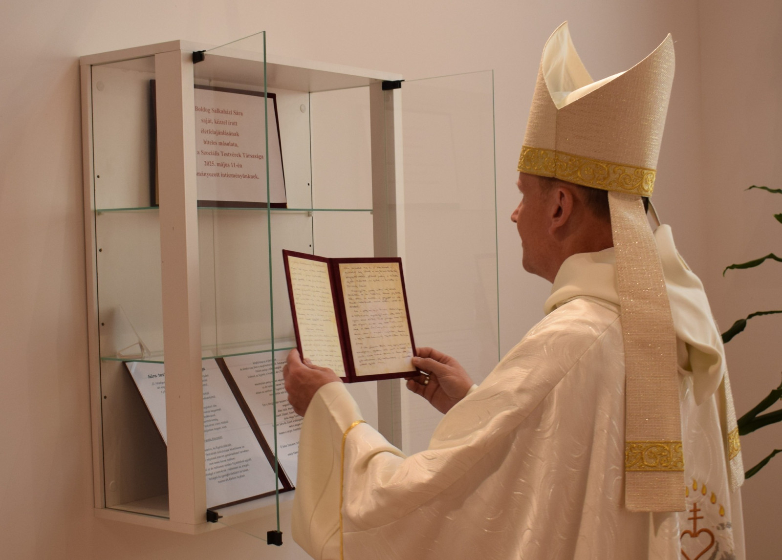 A püspök a szentmise után ünnepélyesen elhelyezte az iskolakápolnában Boldog Salkaházi Sára vértanú kézzel írt önfelajánló imájának hiteles másolatát, amelyet a Szociális Testvérek Társasága adományozott a jubiláló iskolaközpontnak.