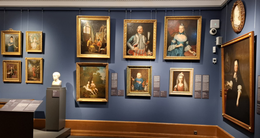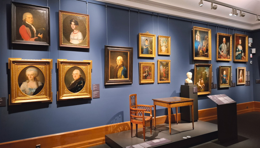 A következő szekció címe: Válogatás közel kétszáz év hazai arcképeiből. Ezt olvashatjuk a falon lévő magyarázó szövegek között: „A 17. századi magyar portré elsősorban reprezentatív és leíró jellegű volt. Nem a magas minőségre vagy az egyéniség megragadására törekedett: a megrendelő elsőrendű szándéka az ábrázolt társadalomban elfoglalt helyének és rangjának bemutatása volt. Az időszak magyar kastélykultúrájának jellegzetes emléke a nemesi családi arcképgaléria, az »ősgaléria«, amely az ősöket, az élő rokon családtagokat – rendszerint egész alakos – festményeken örökítette meg. E festői és ikonográfiai szempontból is konzervatív ábrázolások célja a reprezentáción túl a nemesi-nemzeti öntudat kifejezése volt. A magyar nemesi viselet, mint a nemzeti-rendi azonosságtudat kifejezője, általános a magyar nemesurak és -asszonyok portréábrázolásain. A 17. század arcképfestési hagyomány sokáig, még a következő században is tartotta magát, különösen a középnemesség körében.” A kiállításon látható arcképek közül azért akad néhány, a személyiségjegyeket is megmutató, kiváló mű, mint például Herceg Grassalkovich Antal és felesége kitűnő portréja 1785-ből.