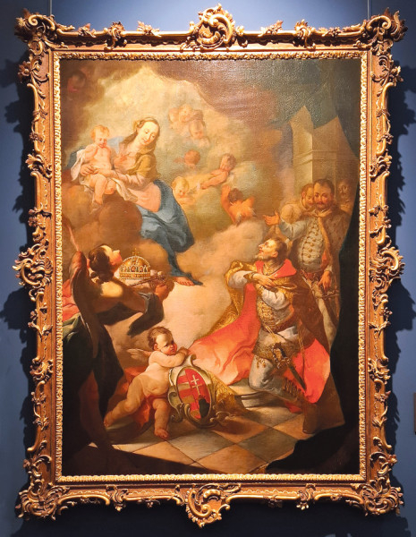 Az utolsó szekcióban magyar témákat láthatunk a 18. század második feléből. A magyar szentek, főképp az Árpád-házi szent királyok, István, László és Imre herceg kultusza a középkortól fogva elevenen élt, és a barokk időkben is töretlenül kitartott. A nemzeti szenteket a kor nemesi divatját követő nemzeti viseletben, a királyszenteket gyakran barokk koronával, Szent Lászlót páncélban, Szent Imrét nemegyszer az osztrák főhercegi koronára emlékeztető koronával ábrázolták. A királyokról festett képeken minden esetben hangsúlyos kísérő az országcímer. Népszerűek voltak a magyar legendaábrázolások is, közülük a legjelentősebb Szent Lászlóé, aki a magyar lovag- és királyeszményt testesítette meg. A tárlatnak ebben a szekciójában láthatjuk a Szent István felajánlja a koronáját Máriának című képet is a 18. század második feléből, alkotója egy dunántúli festő.