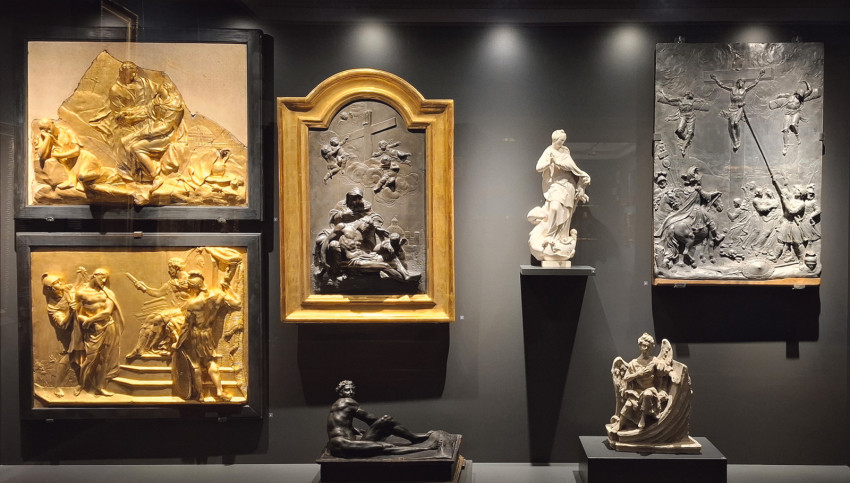A kiállításon ólomból öntött, fából faragott és égetetlen agyagból mintázott szobrok, domborművek is szép számmal láthatók. Égetetlen agyagból nemigen szokott fennmaradni szobormű az évszázadok távolából, egy 1723-ból származó angyal, a pesti belvárosi plébániatemplom kapuszobrának modellje mégis megmaradt. A levegőn megszárított szoborvázlaton a mintázás ujjlenyomatai is látszanak. Az ülő angyalalak a templom főkapuja feletti Szentháromság-csoport bal oldali angyalszobrához készült. A templomhoz a körplasztikákat Hörger Antal kismartoni származású mester mintázta.