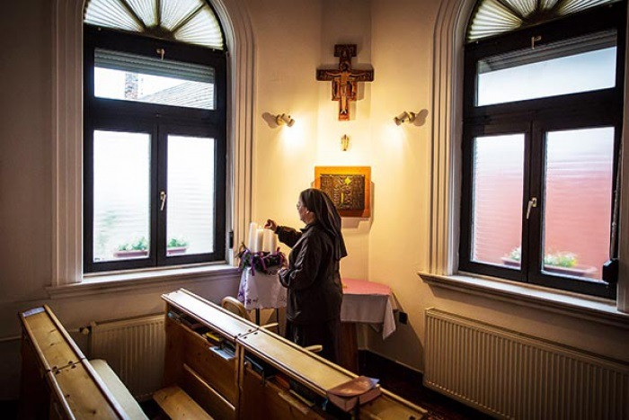 – Aki Istentől jövő meghívást érez rendünkbe, 18 éves kor fölött kérheti felvételét közösségünkbe, így kezdődik a jelöltidő. A fiatal beköltözik az esztergomi anyaházunkba, még civilben járva belekóstol az életünkbe, egy-két évig ismerkedik a szolgálatokkal – sorolja a szerzetessé válás stációit a rendfőnöknő. – A noviciátus a beöltözéssel kezdődik; egy évig nincs külső szolgálat, a novícia imádságban, lelki tanulmányokban, Isten szeretetében elmélyülve készül a hivatására. Az ünnepélyes fogadalomtétel után következik a juniorátus időszaka: a fiatal nővér az ima mellett egyre felelősségteljesebben vesz részt a szegények közötti szolgálatban. A minimum háromévnyi ideiglenes fogadalmas időszakot koronázza meg az örökfogadalom: igent mondunk Istennek egy életre.