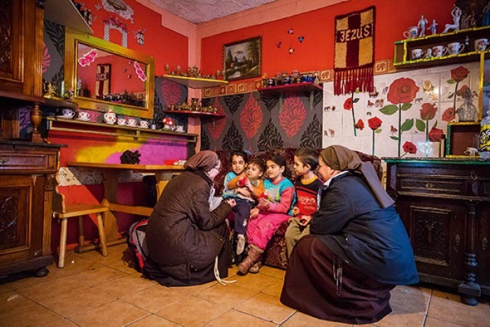 A „Jézus” feliratú fali szőttes alatt, az ágyon most öt gyerek szorong egymás mellett a Mikulás ajándékával, ami a nővérek „közvetítésével” érkezett az imént. A család kenyerével együtt. Adományként kapták a szerzetesek az egyik helyi üzlettől. Bőven akad helye, sóhajt Ágnes nővér.