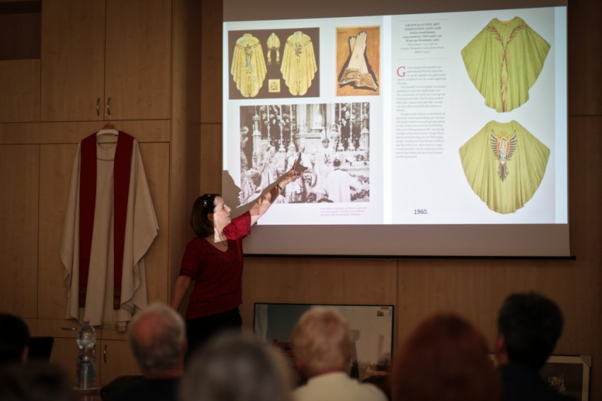 A művészettörténész előadó kitért a történelmi előzményekre is. Ismertette, már jóval a zsinat előtt voltak kísérletek a liturgia és vele összefüggésben a liturgikus öltözet megújítására. Kontsek Ildikó beszélt többek között a 19. században élt Franz Bock aacheni kanonokról, aki háromkötetes könyvet írt a középkori liturgikus ruházatok történetéről, krefeldi plébánosként kiállításokat rendezett középkori miseruhákból, és példának állította azokat saját kora textilművészete elé. Tevékenyen részt vett egy műhely megalapításában is, elősegítette, hogy ott régi minták alapján készüljenek miseruhák. A bécs melletti Döblingbe is letelepedett szerzetesnővérek is ezeket az újfajta – historizáló módon hímzett – miseruhákat készítették. Innen származik az esztergomi főszékesegyház miseruháknak egy része is.
