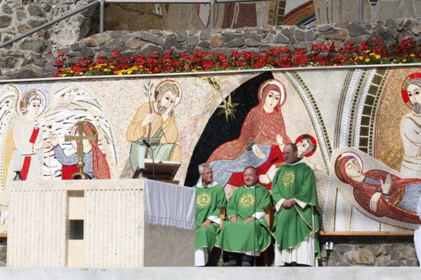 A kegyhelyen harangzúgással fogadták a zarándokcsoportot, és a nemzeti búcsújáróhely igazgatója, Kálmán Peregrin ferences fogadta őket. A szabadtéri oltárnál bemutatott szentmise előtt Dobszay Benedek tartományfőnök tartott katekézist.