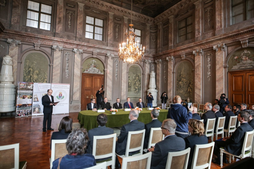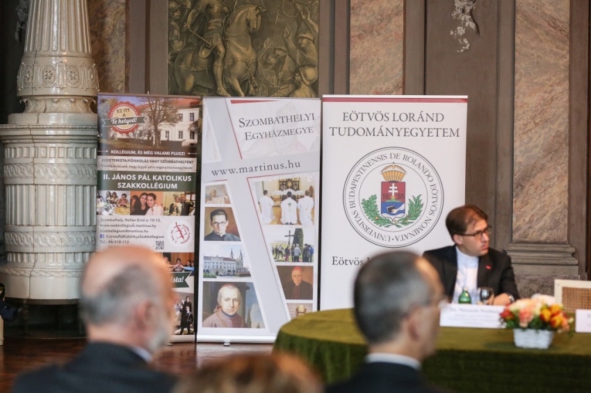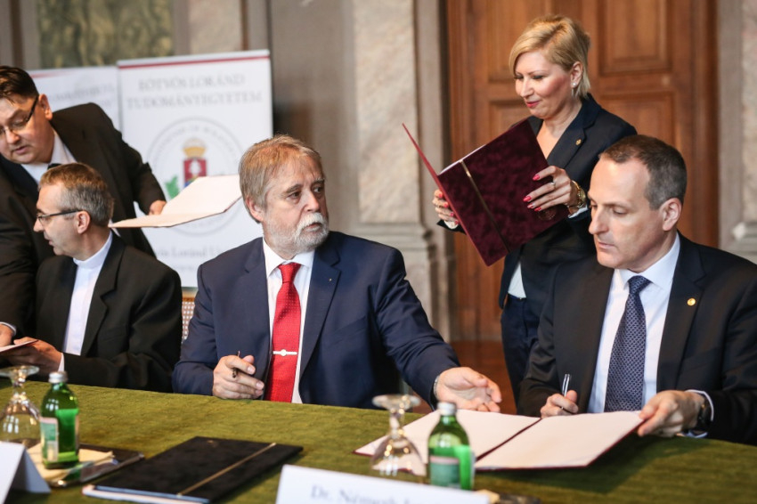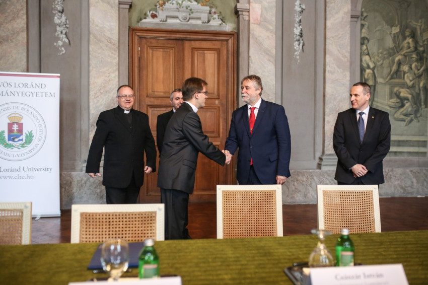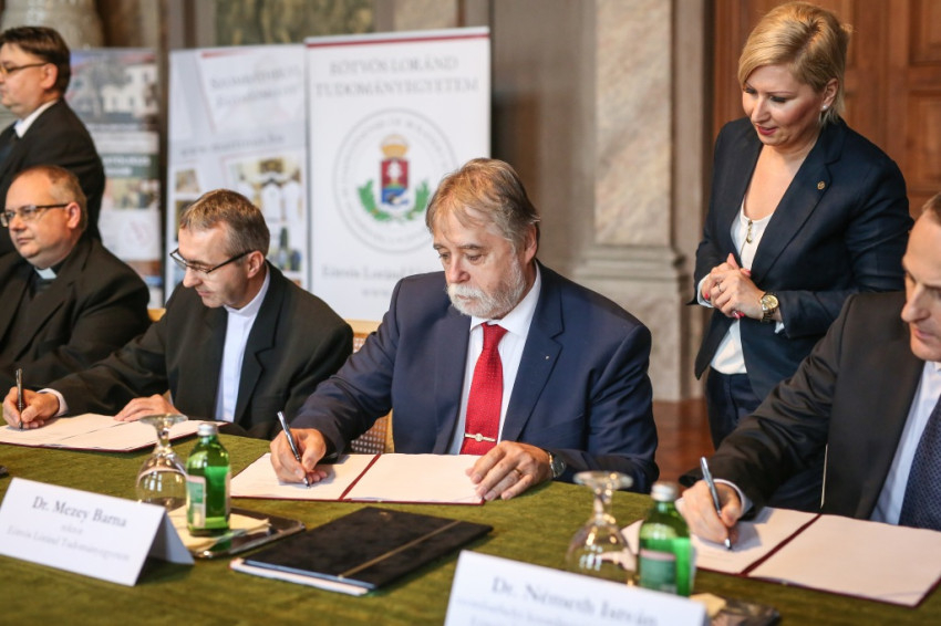 Mezey Barna arról beszélt, mennyire büszke az ELTE a múltjára; arra, hogy a legrégebben működő magyarországi egyetem, és a tehetséggondozás első hazai mecénásának nevezte az alapító Pázmány Pétert. Az egykori főpásztor a három részre szakadt 17. századi ország kilátástalannak tűnő viszonyai közepette ráébredt, hogy Magyarország sorsa függ az elitképzéstől, s hogy ez hosszú távon mindennél kifizetődőbb – és a történelem őt igazolta. Az ELTE az alapító nyomdokain járva mindig partnereket, szövetségeseket keres e feladat minél jobb ellátásához, a hálózatok világában ugyanis csak így lehet versenyképesnek maradni. Az integrációs megállapodás aláírását ezért most újabbak követik az egyházmegyével, a Győri Hittudományi Főiskolával, a szakkollégiummal és az egyetemi lelkészséggel, ami portfólióbővülést hoz az ELTE, és kínálatbővülést a diákjai számára – tette hozzá.