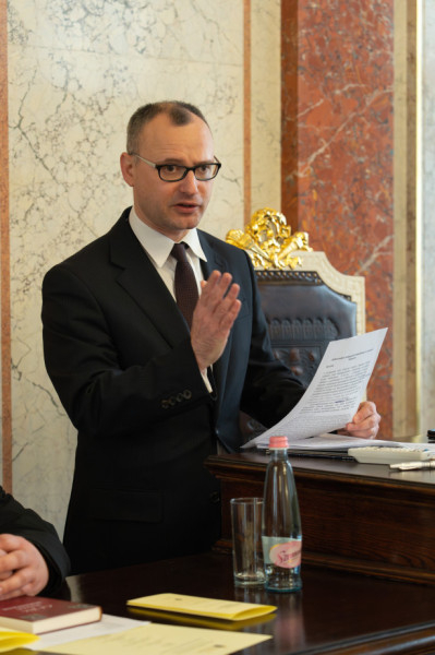 Szabó Péter, a KJPI elnöke bevezetőjében utalt a közigazgatás kifejezés és annak mögöttes tartalmának nehézségeire az Egyházban és az egyházjogban. Felhívta a figyelmet arra, hogy egyes szerzők szerint már maga a kifejezés is problémás az Egyházban, és nehezen vihető át a kánonjogba. A világi jogi logika alapján meggyökeresedett kifejezés ugyanis feltételezi a demokratikus láncolatot, a hatalom választói akaratra való visszavezetését. Az Egyház szakrális hatalomfelfogása azonban nem a választói akaratban, hanem Isten szándékában látja a hatalom forrását.