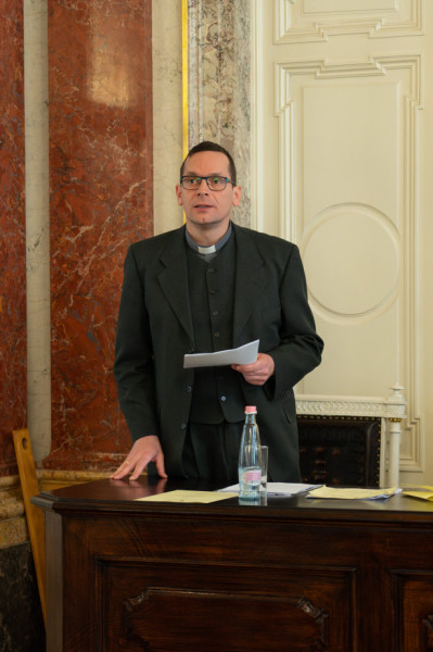 Második előadóként Fekete Szabolcs Benedek szombathelyi segédpüspök az egyházi közigazgatás aktuális kérdéseiről beszélt, amihez először elméleti megalapozást nyújtott. Az egyházi közigazgatás olyan mindennapi területeit érintette, mint a plébániai struktúra, a plébánia kormányzása és az anyakönyvezési szabályok kapcsán felmerült bizonytalanságok. Kiemelte, hogy az egyházi közigazgatás számos kifejezése vagy mögöttes jogi tartalma elavulttá vált, ezért új jogra és részleges jogalkotásra van szükség. Ilyen területnek minősítette többek között az adót, az egyházi közigazgatáshoz kapcsolt feladatokat és elnevezéseiket, valamint a képviselő-testületet és szabályzatát.