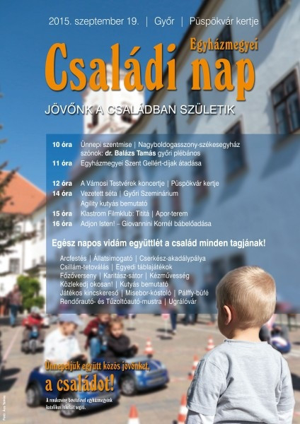 „Jövőnk a családban születik” mottóval idén szeptember 19-én, szombaton újra megrendezik az egyházmegyei családi napot a győri Püspökvár kertjében. Az elmúlt évekhez hasonlóan a katolikus családok találkozását elősegítő rendezvény ünnepi szentmisével kezdődik 10 órakor, melynek főcelebránsa Pápai Lajos megyéspüspök, szónoka pedig Balázs Tamás, a győri Szent Imre-templom plébánosa lesz. A szertartás után adják át az egyházmegyei Szent Gellért-díjakat, majd a Püspökvár kertjében megkezdődik az egész napos majális.