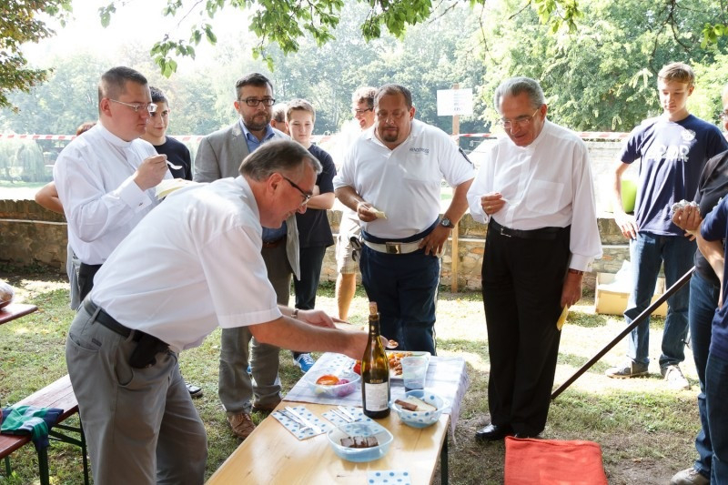 Mindeközben már készült a pincepörkölt az egyházmegyei főzőverseny résztvevőinek üstjeiben, melyet délben Pápai Lajos vezetésével végigkóstolt a spontán alakult zsűri. Idén a csornai Rákóczi-iskola csapata nyert, a dobogóra pedig a győri Apor-iskola, valamint holtversenyben harmadikként a győri Prohászka-iskola és a győri Szentlélek-templom ministránsai léphettek fel.
