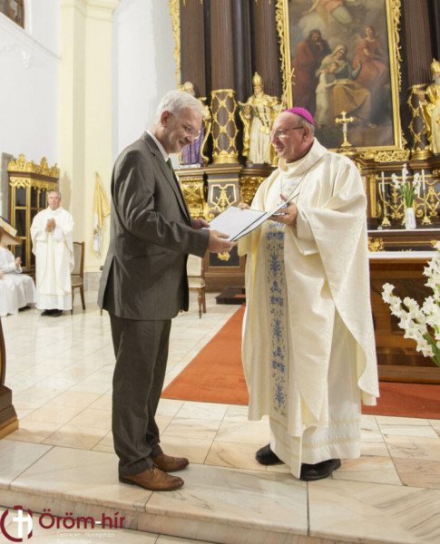A plébános ezután a kántor-karnagyot méltatta, aki az ünnepség napján pontosan harminc éve segítette az egyházközséget Isten dicsőítésében és üdvözítő művének magasztalásában. Krakomperger Zoltán rámutatott: Dobos Mihály annak érdekében, hogy kántori szolgálata a lelkeket Istenhez és az égiekhez emelje, folyamatosan képezte ének-zenei ismereteit.