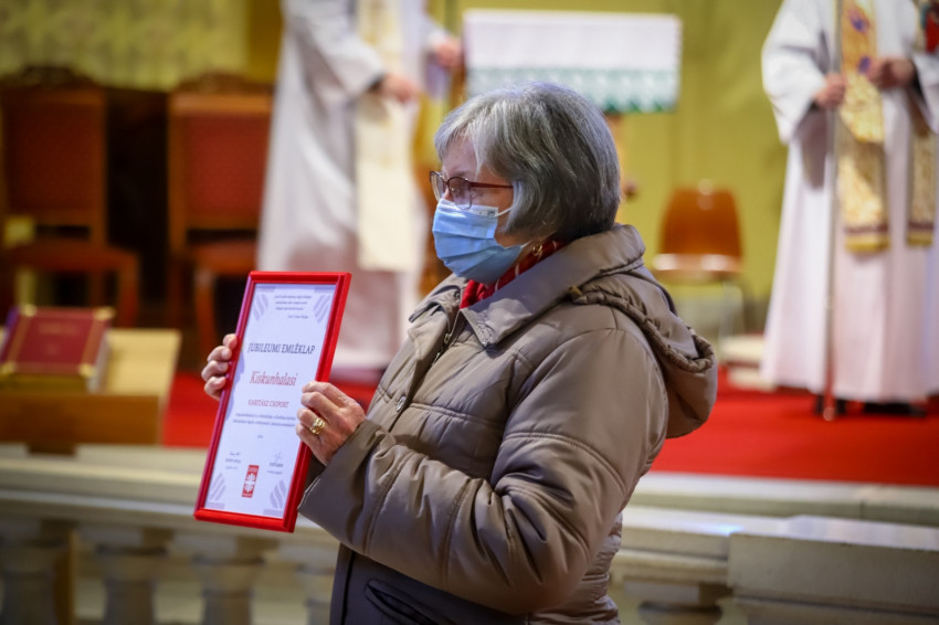 A szentmise végén a főpásztor oklevelet adott át a kiskunhalasi karitászcsoport vezetőjének, Kuti Sándorné Kovács Máriának, aki a harmincéves helyi közösség lelkes és példamutató vezetője.