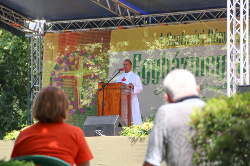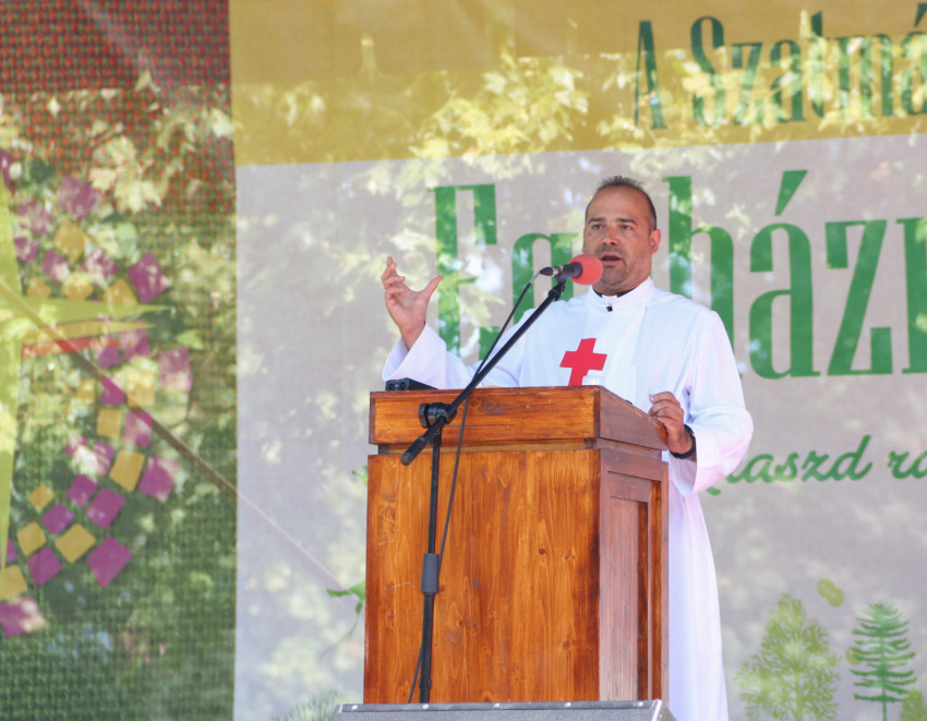A tizenegy órai megnyitó után a pódiumon plébániai csoportok léptek fel és énekükkel megadták az alaphangulatot a kertben. Az Úrangyala elimádkozására már mindenki az egyházmegye napja szeretetteljes, örömteli légkörében érezhette magát. Az ima után tartotta meg előadását György Alfréd MI kamiliánus pap, aki a mottó – „Áraszd ránk kegyelmedet Urunk!” – kapcsán fogalmazta meg, milyen a keresztény ember magatartását. „A kegyelem mindig árad, a mi feladatunk pedig, hogy észrevegyük. Ez folyamatos élet, a Jóisten szeretetnyelve, amiben benne vagyunk mi is. A kegyelem általunk is áradhat, ebben hinnünk kell. Isten annyira megbízik bennünk, hogy ránk árasztja kegyelmét, hogy utána ebben részesítsük mi is embertársainkat.”
