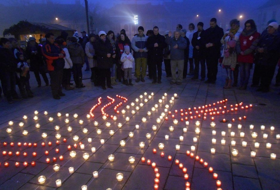 A fehér és piros mécsesekből kirakott szimbólumot Horváth Tamás, Csót község plébánosa áldotta meg. A fehér mécsesek egy keresztté álltak össze, amiből kilobbantak a pirosak által alkotott szeretetlángok. Rövid beszédet mondott Salgó Ferenc esperes-kanonok plébános, jelen volt Szijártó László kerületi esperes-plébános is. A szolidaritási akcióban az Erkel Ferenc Ének-Zenei Általános Iskola nagykórusa a Dona nobis pacemet énekelte.