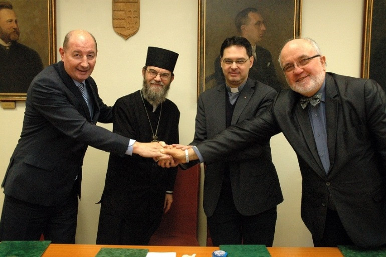 A Miskolci Egyetem részéről Torma András rektor, az állam- és jogtudományi kar részéről Farkas Ákos dékán, a Miskolci Egyházmegye részéről Orosz Atanáz megyéspüspök, a Görögkatolikus Cigány Szakkollégium részéről pedig Makkai László igazgató írta alá a kiegészítő együttműködési megállapodást.