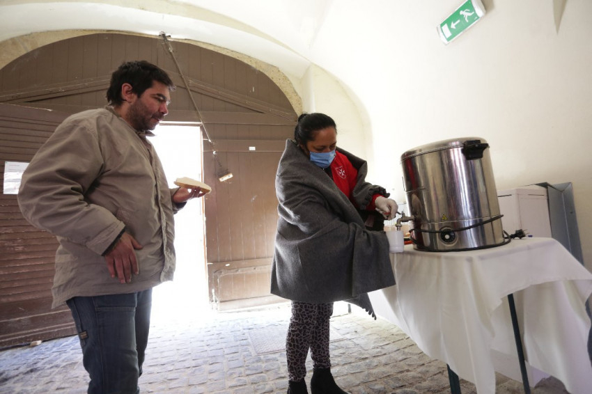 De átalakult a hajléktalanok ellátása is. Első állomásunk a nappali melegedő helyett berendezett reggelizőhely a régióközpont kapualjában. „Vannak ajtók, amiket nem zárhatunk be, mert azok rekednének kint, akiknek a legnagyobb szüksége van ránk” – szögezi le a Szolgáló Szeretet Háza hajléktalanokat ellátó intézmény vezetője, Sándor Andrea. „Kevesebben jönnek, mindenki igyekszik meghúzódni valahol, az utcán is alig vannak. Akik igazán rá vannak szorulva, mert kint töltik az éjszakákat, ők jönnek be, fürdeni és reggelizni.”