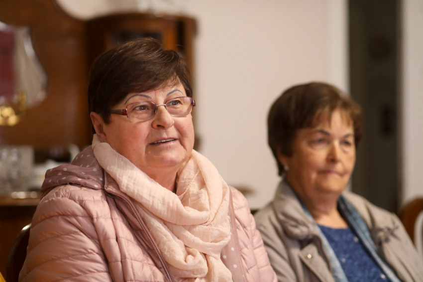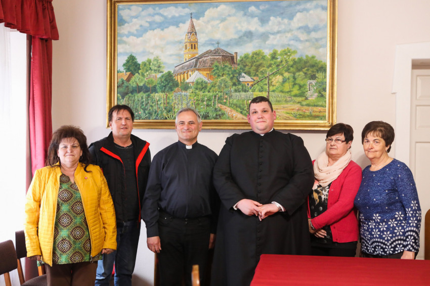 Látogatásunkkor a két lelkipásztor, Jeney Gábor plébános és Pecsmán Viktor káplán fogad bennünket. Sokan ülünk le beszélgetni az asztalhoz: velünk van Májer Ferencné a házas közösség és Móczárné Zsikla Márta a máltai csoport képviseletében, valamint Szabadi István, a plébániai képviselő-testület tagja és Kévés Pálné sekrestyés.