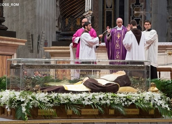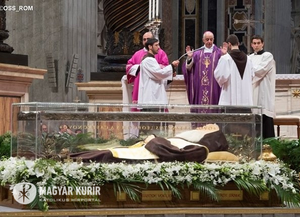 Majd rámutatott: ebben áll életünk drámaisága: mindennap magunkra kell vennünk Krisztus keresztjét. Ebben Pio atya is fényes példát mutat nekünk, aki így fogalmazott: „Nagyon jól tudom, hogy a kereszt a szeretet záloga, a megbocsátás előlege.” És nem igazi az a szeretet, melyet nem a kereszt táplál. Az csupán szalmaláng. Pio atya hivatása az volt, hogy hordozza, testében is megjelenítve, Jézus szenvedését.