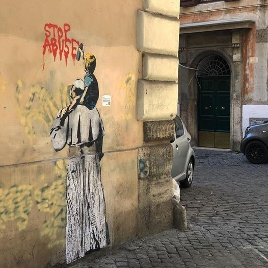 Az olasz Street Art művész, Tvboy alkotását a kiskorúak ellen elkövetett – a Katolikus Egyházat is érintő – bántalmazási botrányok ihlették. A Rómában, a Piazza Navona közelében található Vicolo degli Osti utcában készült graffiti Ferenc pápát ábrázolja, nyakában egy kisgyerekkel, aki a következő feliratot fújja a falra: „Elég a bántalmazásokból” („Stop abuse”) .