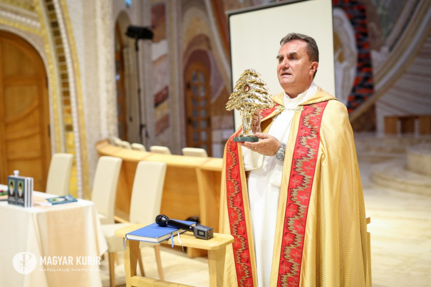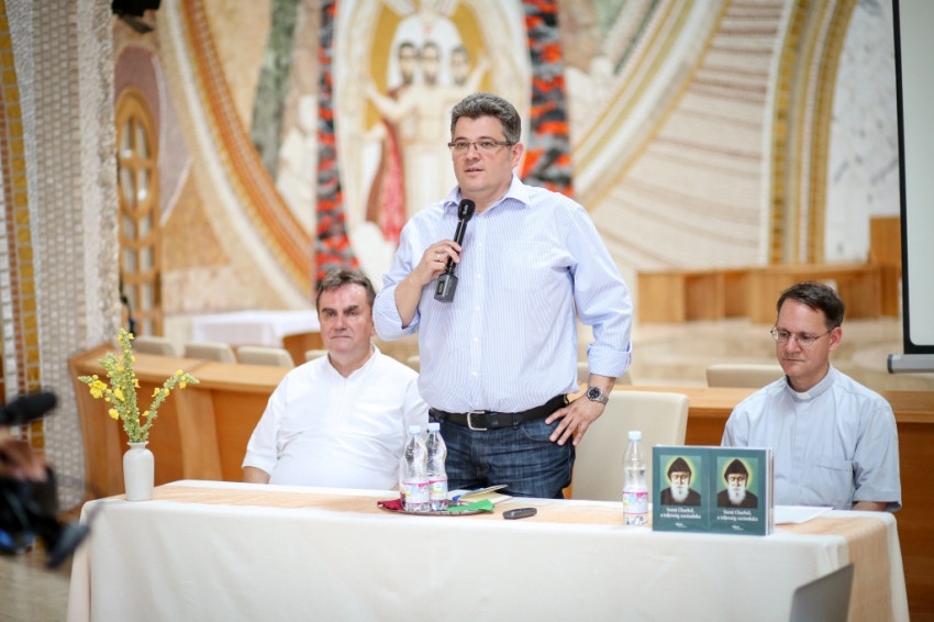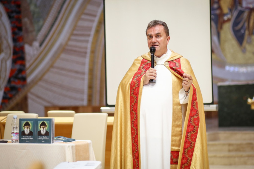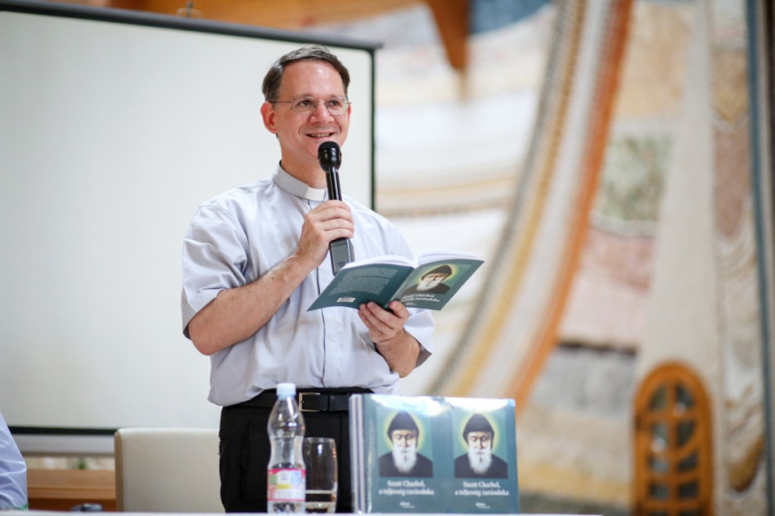 Héray András arra is rámutatott, hogy egy szentről szóló könyv számtalan kérdést vet fel. Ma egy felgyorsult, zajos világban élünk, szinte mindenről tudunk, és ilyen körülmények között nehéz elmélyednünk. Erre ad példát ez a könyv. A libanoni remete élete a modern kor embere számára is meghívás. Egyrészt, hogy keressük azt a csendet, amely nem üres, hanem szeretettel, Isten jelenlétével megtöltött csend. Ez tapasztalták meg mindazok, akik találkoztak a maronita szerzetessel, akitől a kétkezi munka sem állt távol, nagyon sokat dolgozott a földeken, Isten dicsőségére. Tökéletesen megvalósította a szerzetesi hagyományra jellemző „imádkozzál és dolgozzál” intelmet. Remeteként is számos emberről gondoskodott, bölcs tanácsokat adott a hozzá fordulóknak. Honnan volt benne ez a bölcsesség? Az imádság révén, ami teljesen átjárta az életét. Órákon keresztül imádkozott, az Eucharisztia előtt térdelve. Ez meghívás számunkra is: tegyük félre fontosnak vélt dolgainkat, és ha csak néhány percre is, de mindennap boruljunk le az Oltáriszentség elé, ahol Krisztus vár bennünket, ismerjük fel, hogy Ő a legfontosabb. Valóban Isten jelenlétében élni, ezt valósította meg Szent Charbel, egyértelműen bizonyítják ezt a kötetben olvasható tanúságtételek. Az a radikális önsanyargatás és feltétlen engedelmesség, ami jellemezte őt, arra vezethető vissza, hogy lángoló szeretettel szerette a Megváltó Krisztust. Ezért is igazán jelentős dolog, hogy itt, a gazdagréti Szent Angyalok-templomban tisztelhetjük az ő ereklyéit, kérve a közbenjárását – hangoztatta Héray András, hozzátéve: Szent Charbel papságát és szerzetességét, remeteségét valóban úgy élte meg, mint a szenvedő Krisztus követését, egészen a Golgotáig, nagyon sok áldozatot vállalt magára mások lelki üdvösségéért, s mindezt hatalmas szeretetből tette.