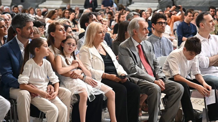 Chiara Corbella szeme tükröződik vissza fia, Francesco sötét szemében, aki az első sorban ül édesapja Enrico, nagyszülei Roberto és Maria Anselma, nagynénje Elisa és unokatestvérei társaságában. Francesco most 13 éves.