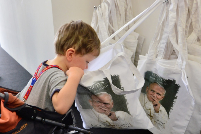 Kisfiú kukucskál bele egy II. János Pál arcképével díszített vászontáskába az "Alázat és bátorság, amely megváltoztatta a történelmet" című kiállítás ajándékboltjában. A Vatikáni Múzeumban rendezett kiállítás fotókkal és videókkal mutatja be a holnap szentté avatandó két pápát.