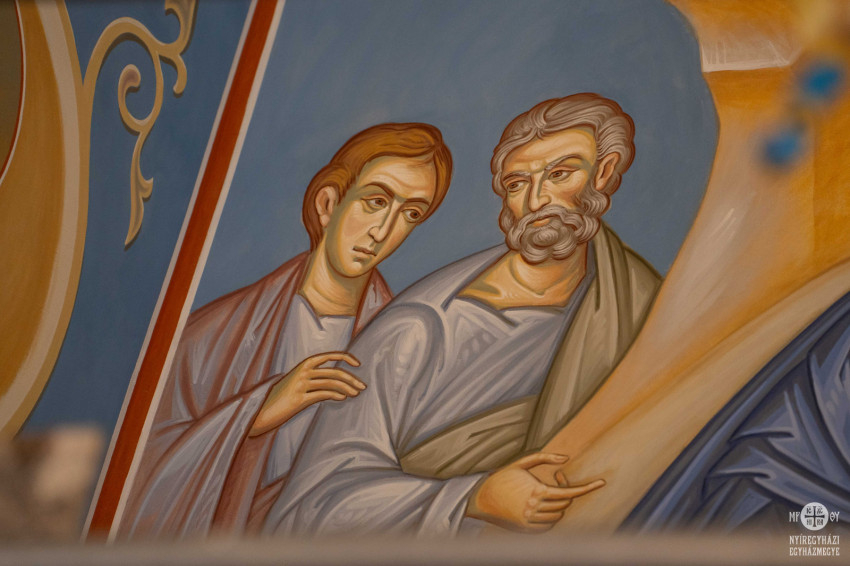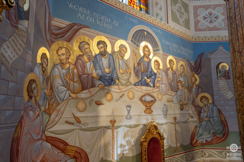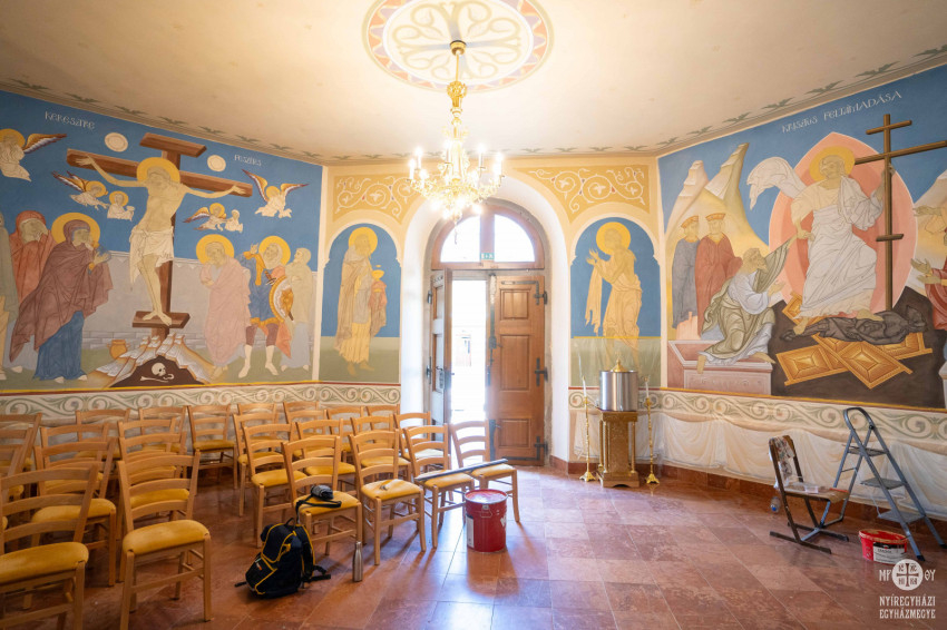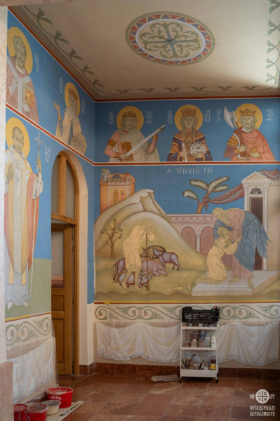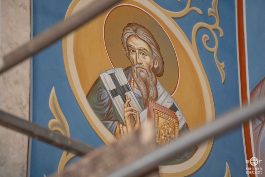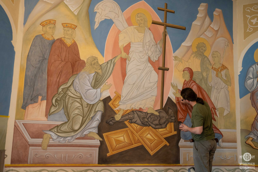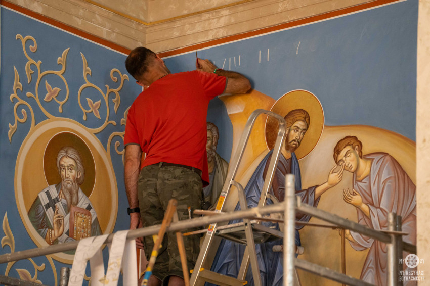 A munkálatok jelenleg a kereszthajóban, a két oldalsó bejáratot magában foglaló félkörívben zajlanak, valamint a karzat alatti falfelületeken és a szentélyben, az ikonosztáz belső falán.