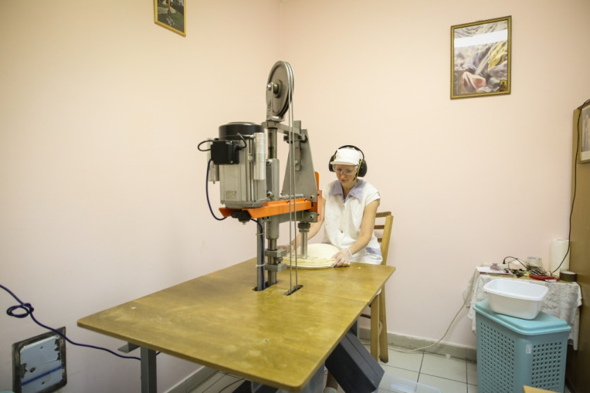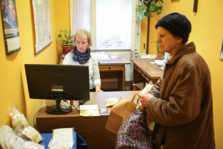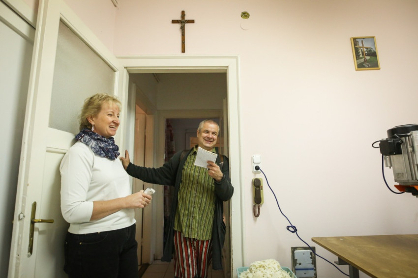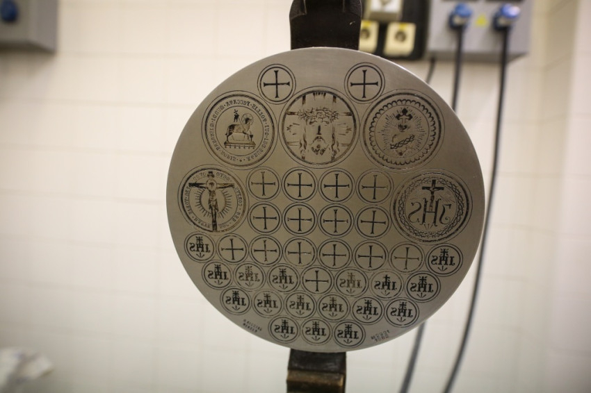 A budapesti Haller téri plébánia épületében, az alagsorban beszélgetünk. A gyártási folyamat kezdőlépéseivel, a szitálással és a keveréssel ismerkedünk. A helyszín, a tevékenység és az egész hangulat meseszerű kissé: talán azért, mert minden kicsi, barátságos, emberléptékű, ám közben tudjuk, hogy mégiscsak komoly üzemben vagyunk, ráadásul országos hatókörűben, amelynek termékei minden egyházmegyébe eljutnak.